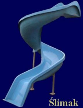 falowane oraz skrętne po ślimaku o wysokości zamocowania od 80 cm. do 270 cm. Ślizgawki są przystosowane do zjazdu na trawę, do piaskownicy lub do wody.